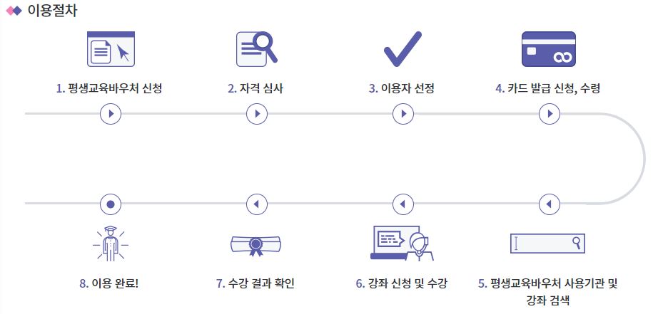 - 처리 절자 : 신청서 접수(신청자) >>> 자격 요건 조사 및 확인(국가평생교육진흥원) >>> 이용자 선정 및 토지(국가평생교육진흥원) >>> 이의신청(미선정자) >>> 이의 재검토 및 결과 통보(국가평생교육진흥원, 사업관리위원회) >>> 평생교육바우처 카드 신청(이용자→금융기관) >>> 평생교육바우처 카드 수령(이용자) >>> 바우처 사용기관을 통해 강좌 수강(이용자)