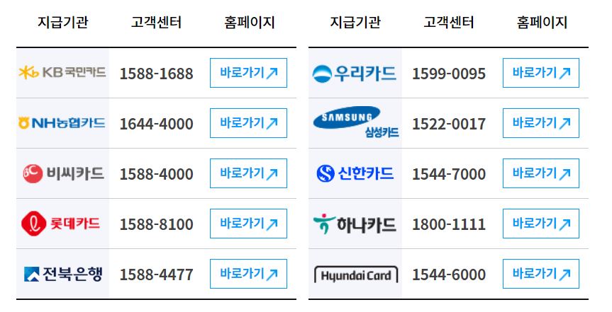 - 신용카드사 : KB국민, NH농협, 롯데, 삼성, 신한, 우리, 하나, 현대카드