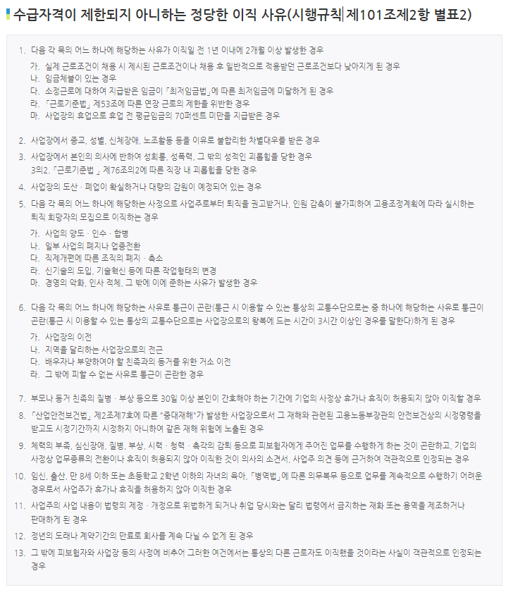 * 다만, 1주 소정근로시간이 15시간 미만이면서 소정근로일이 2일 이하인 근로자로서 90일 이상을 근로한 경우에는 퇴진 전, 24개월간 180일 이상 - 일용근로자의 경우에는 수급자격 인정신청일 이전 1개월간 일한 일수가 유급휴일 포함 10일 미만일 것, 또는 수급자격 인정신청일 이전 14일간 연속하여 근로내역이 없을 것 등의 수급요건이 추가됩니다.