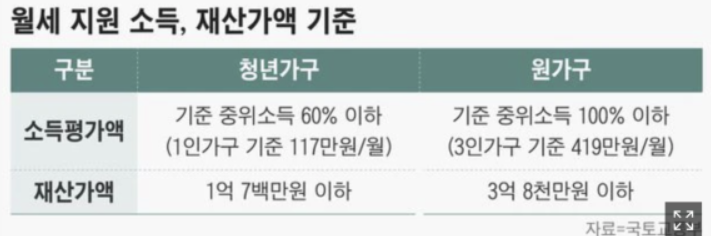 *월세가 60만원을 초과하더라도 보증금 월세 환산액과 월세액을 합산하여 70만 원 이하인 경우 지원 가능합니다. - 청년가구 기준 중위소득 60% 이하여야 합니다.